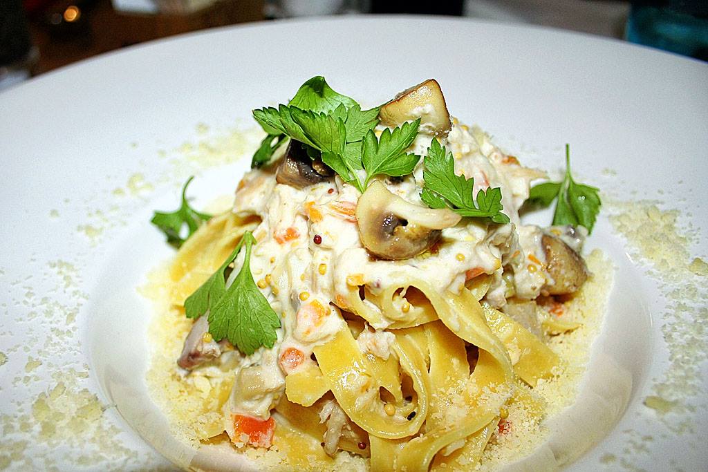 Следующее блюдо – паста с мясом кролика плюс белый соус, грибы, зерна горчицы и пармезан. Кролик растушивается с “участием” бульона, тимьяна, лука и белого вина. Паста делается из итальянской муки тут же на кухне ресторана.